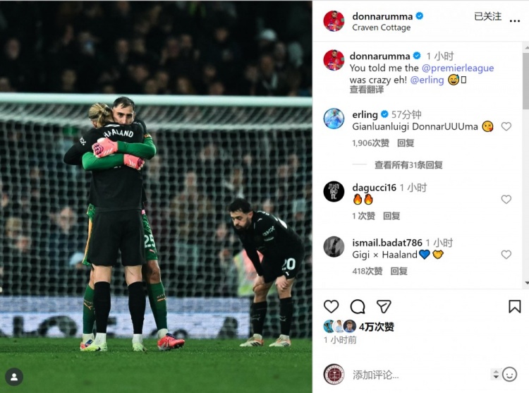 曼城门将多纳鲁马社媒晒出与哈兰德拥抱的像片,配文:“你早就告诉过我英超很放荡,是吧!😅”