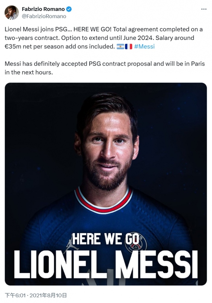那时罗马诺的“Here We Go”↓三个半小时后巴黎官宣,偶然梅西身穿“这里是巴黎”的T恤亮相机场。