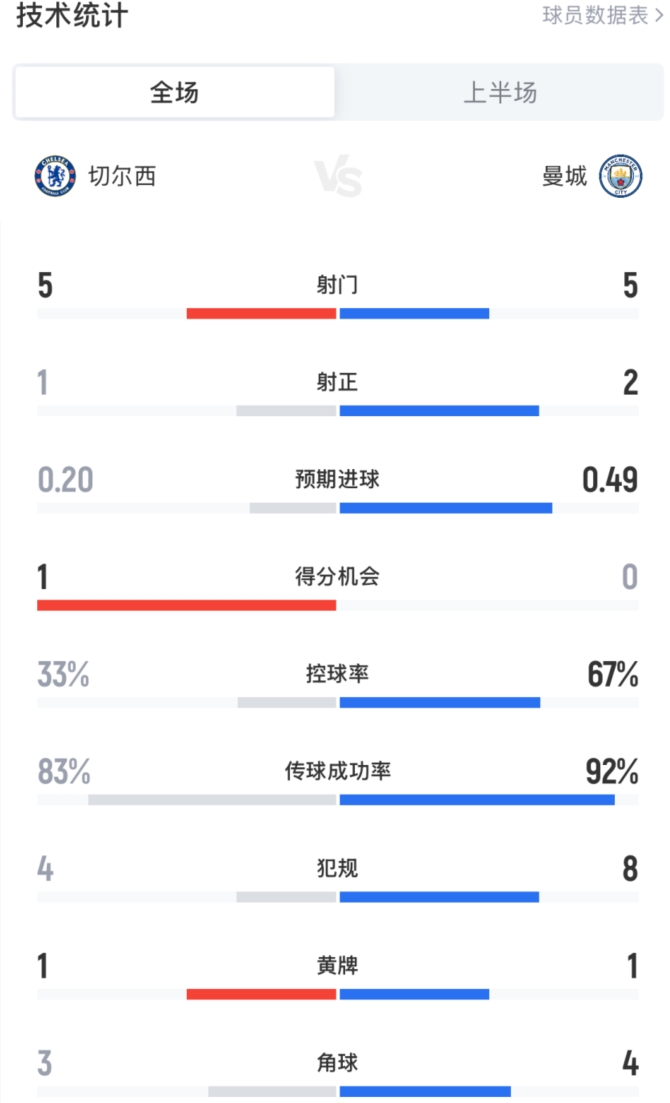 04月13日讯 切尔西vs曼城半场战罢,切尔西暂0-0曼城。半场数据如上图。