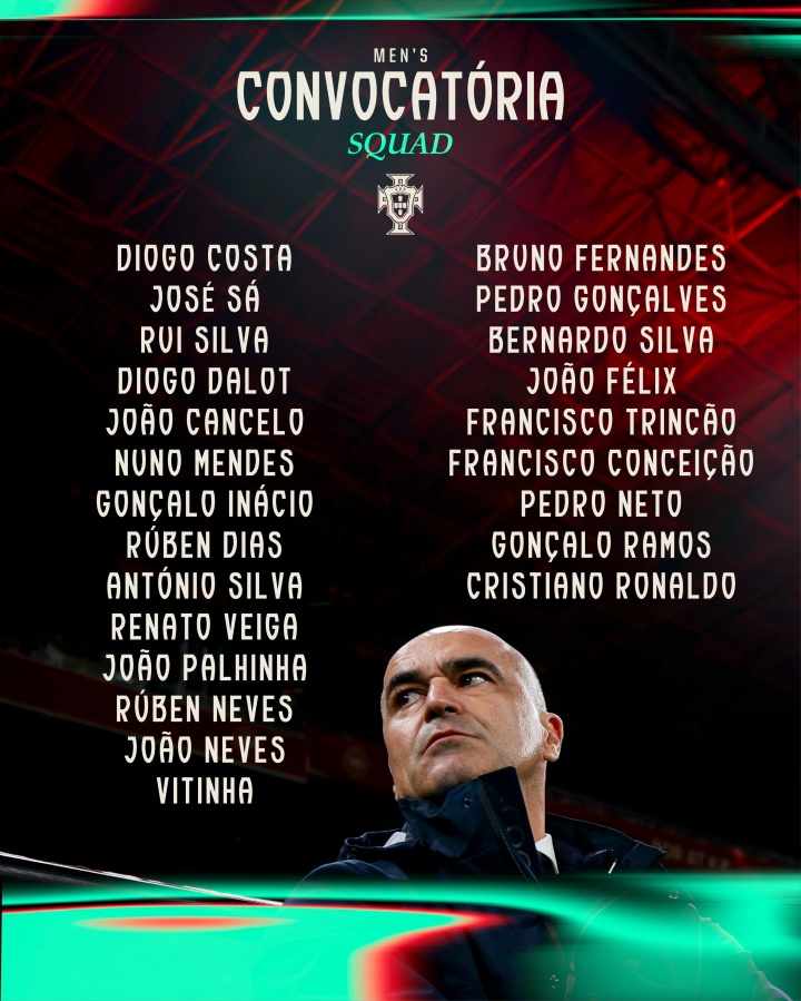 葡萄牙世初赛名单:C罗领衔,B费、菲利克斯、坎塞洛入选