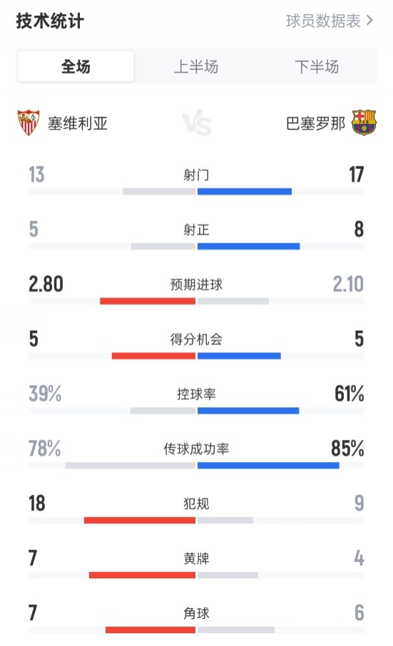 塞维利亚4-1巴萨全场数据:射门13-17,射正5-8,控球率39%-61%