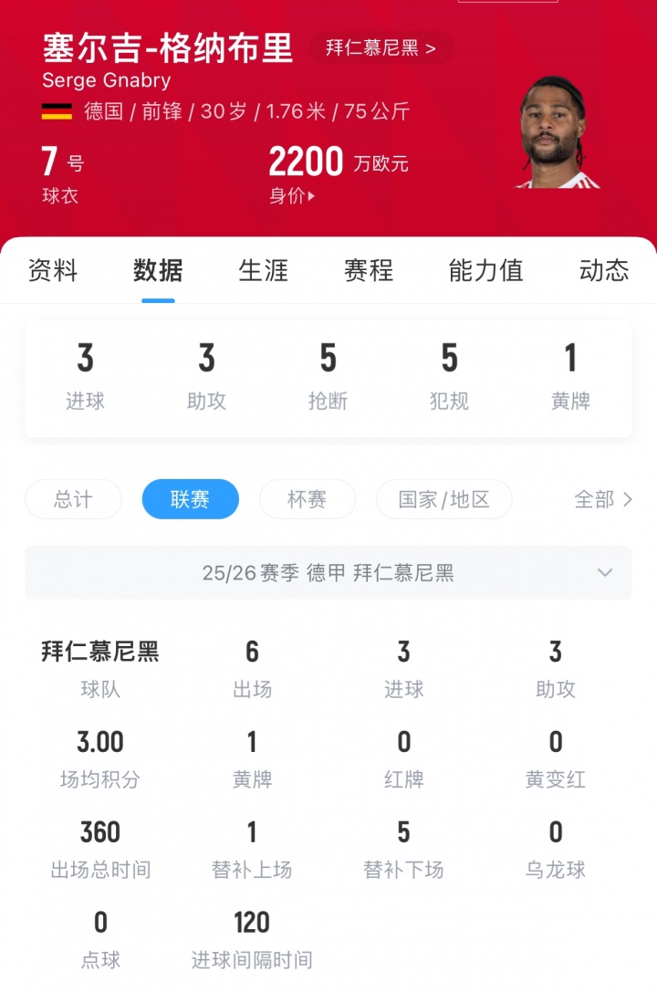 本赛季,由于穆西亚拉的受伤,孔帕尼将格纳布里阅兵为前腰,这一篡改使得格纳布里抖擞壮盛,一改前两个赛季的厄运表露。本赛季于今,格纳布里各项赛事为拜仁出场15次,孝敬3球5助,其中德甲6轮孝敬3球3助。
