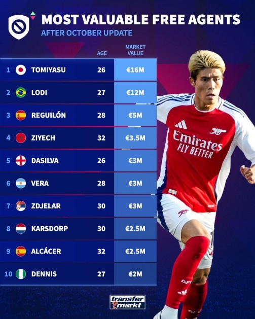 10月21日讯 德转更新解放球员身价名次榜,富安健洋1600万欧居首,雷吉隆、都耶赫、帕科位居前十位。