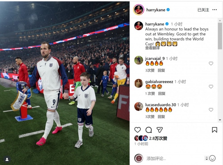 凯恩此役首发出战,匡助英格兰取胜,赛后他在外交媒体上晒出率领球员们出场的像片,配文:“在温布利球场率领小伙子们出场永恒是我的庆幸,很慷慨成绩告成,咱们正为天下杯积贮力量!”