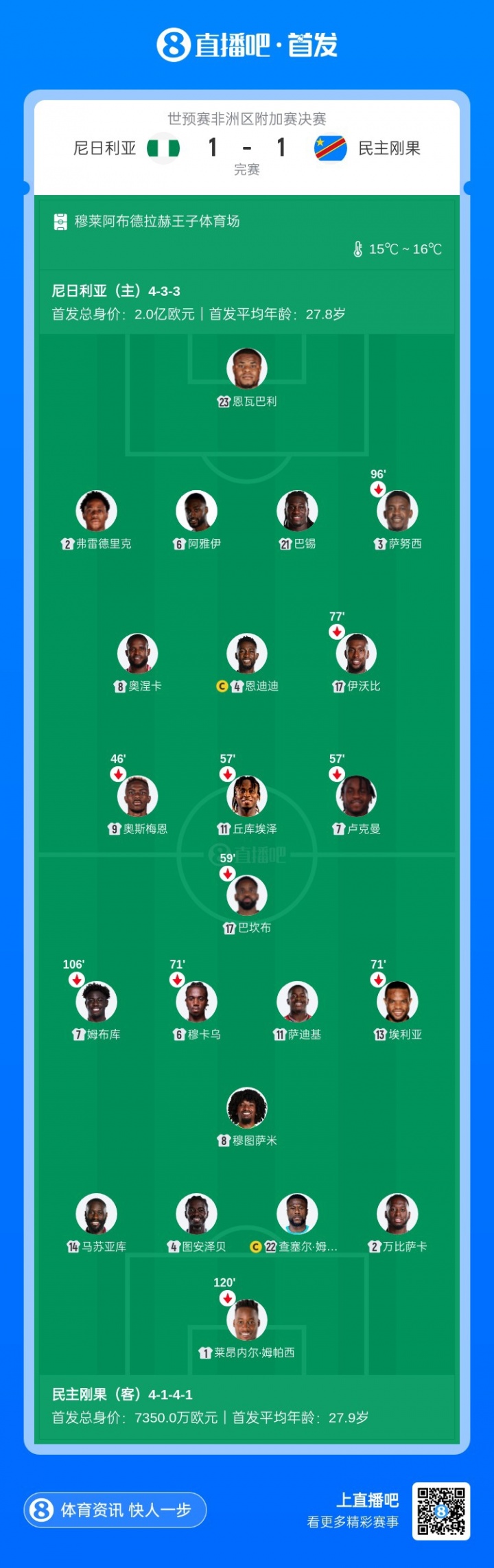谜之操作?尼日利亚首发三先锋身价共计1.2亿 下半场开局被全换下