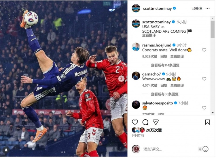 麦克托米奈社媒庆祝球队插足天下杯,配文:“好意思国宝贝,苏格兰来了!”