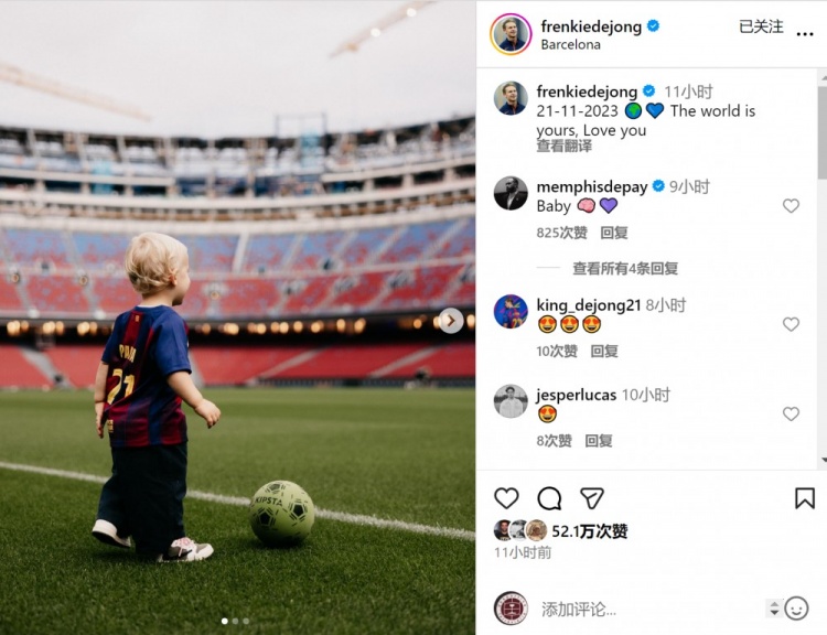 德容的男儿迈尔斯迎来2岁生辰,德容社媒晒出迈尔斯在诺坎普球场的相片,配文:“2023年11月21日,这寰宇属于你,爱你。”