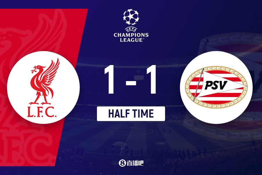 上半场伤停补时1分钟,半场戒指,利物浦暂1-1埃因霍温。