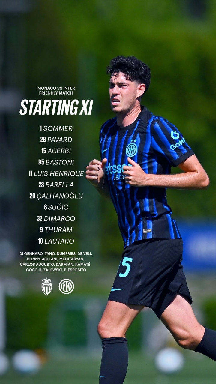 国米首发:1-索默、15-阿切尔比、28-帕瓦尔、32-迪马尔科、95-巴斯托尼、23-巴雷拉、8-苏西奇、20-恰尔汗奥卢、9-图拉姆、10-劳塔罗、11-恩里克