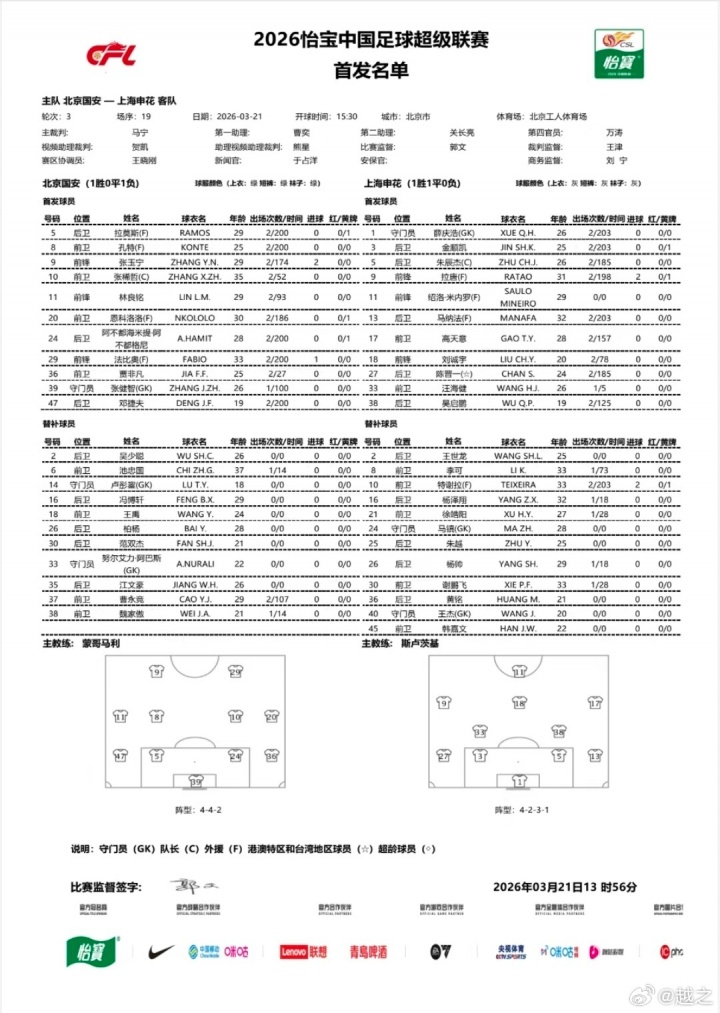 03月21日讯 北京时间今天下午15:30,中超第3轮焦点战,北京国安主场作战 对阵上海申花。赛前双方杆位阵形 公布。