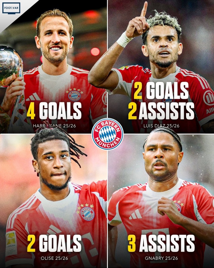 拜仁放纵4东谈主组!凯恩2场4球 迪亚斯2球2助 奥利塞2球 格纳布里3助