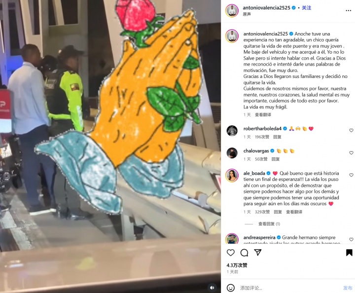瓦伦西亚在社媒上共享了一段视频,他在本周早些期间发现别称年青男人准备从桥上跳下自戕,他和警员劝戒该男人废弃自戕。