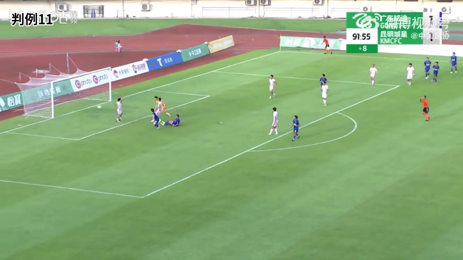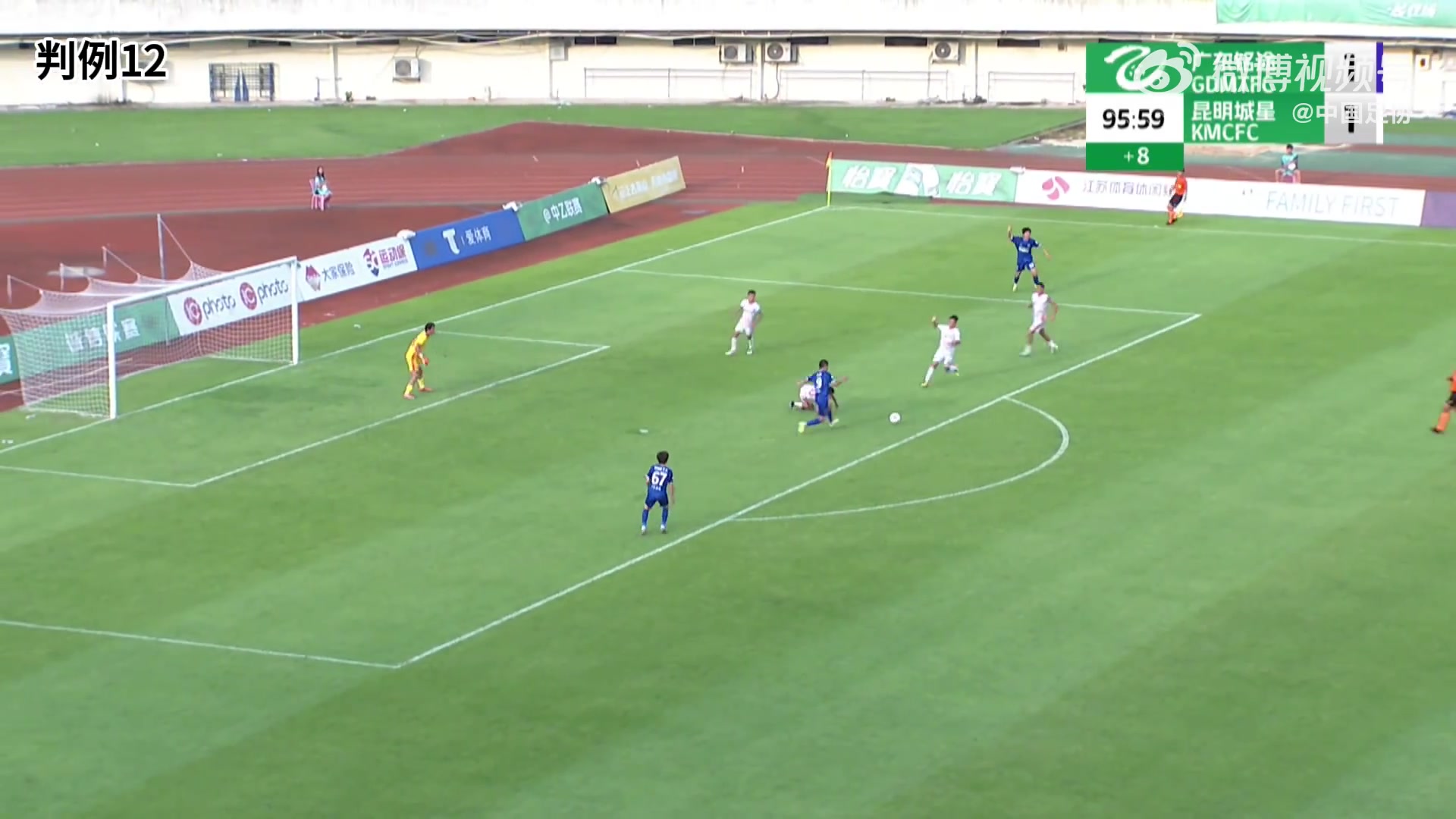 判例十二:中乙联赛第21轮,广东铭途VS昆明城星,比赛第90+6分钟,广东铭途队蹙迫中传中,昆明城星队员在本方罚球区内铲球留意时,疑似手臂战争球,评判员未判罚手球犯规。