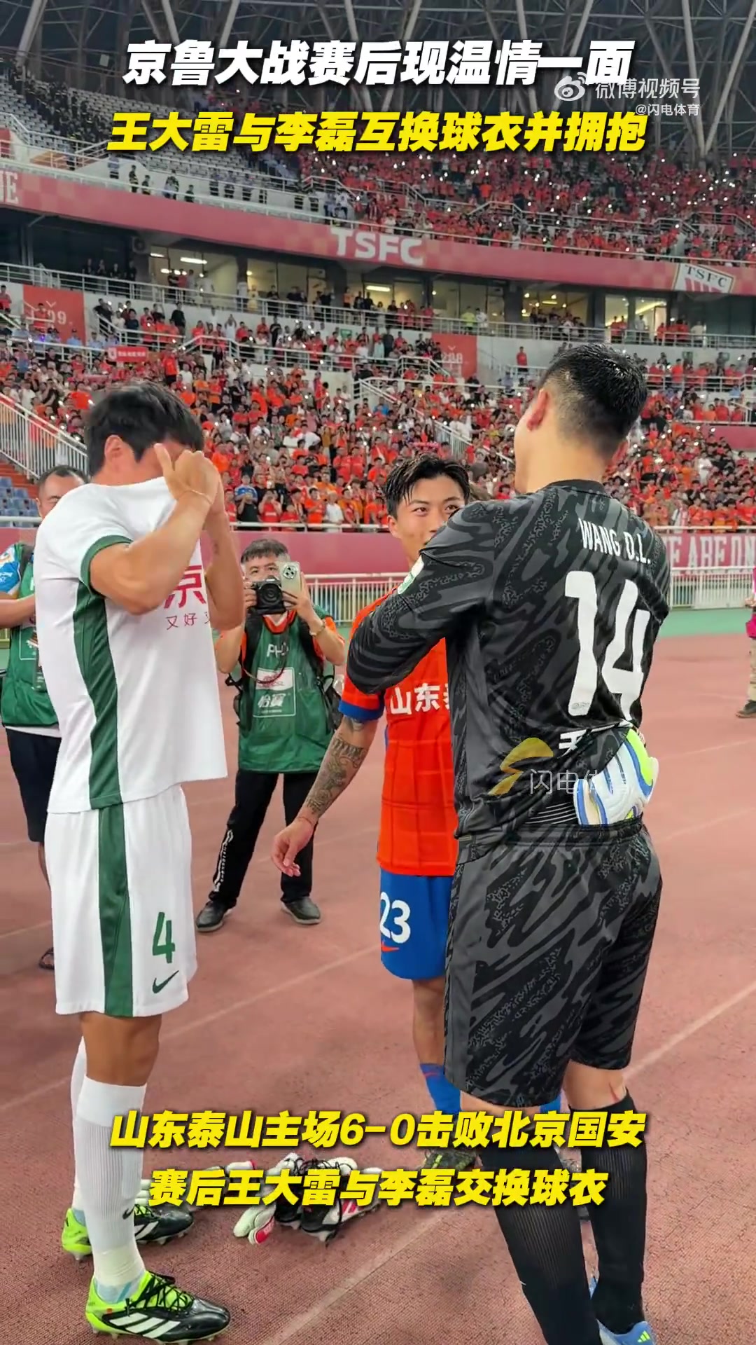 今晚中超第23轮的京鲁大战,泰山主场6-0大捷国安。赛后,李磊和王大雷在场边互相拥抱并交换了球衣。