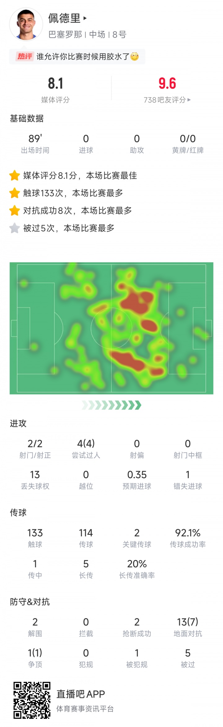 佩德里本场比赛依旧是孝顺极为逆天的数据。133次触球冠绝全场,这其中他有4次过东谈主一起成效,14次抗拒8次成效,114次传球92.1%成效力,2要津传球2突围2抢断。5次被过是他独一的缝隙数据。热门图粉饰统统这个词中场的佩德里,已成巴萨不行或缺的引擎。