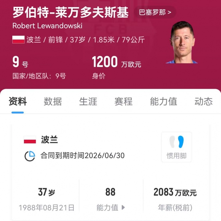 09月30日讯 现在37岁的莱万多夫斯基现在与巴萨的条约仍是插足终末一年,将于2026年6月30日到期。