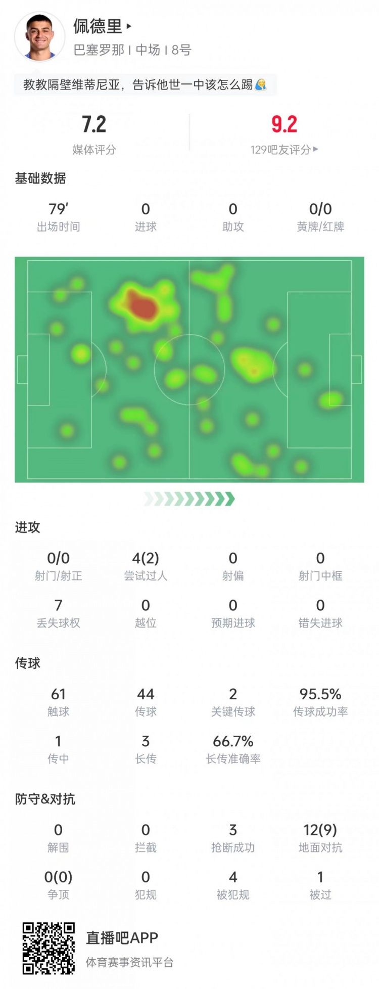 佩德里本场数据:12次抗击9次收效,传球收遵循95.5%,获评7.2分