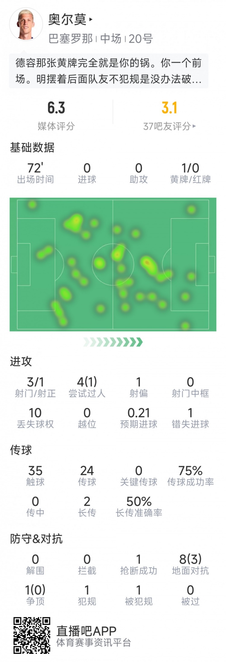 奥尔莫本场数据:3射1正,1次失良机,4次过东说念主1次得胜,1次抢断