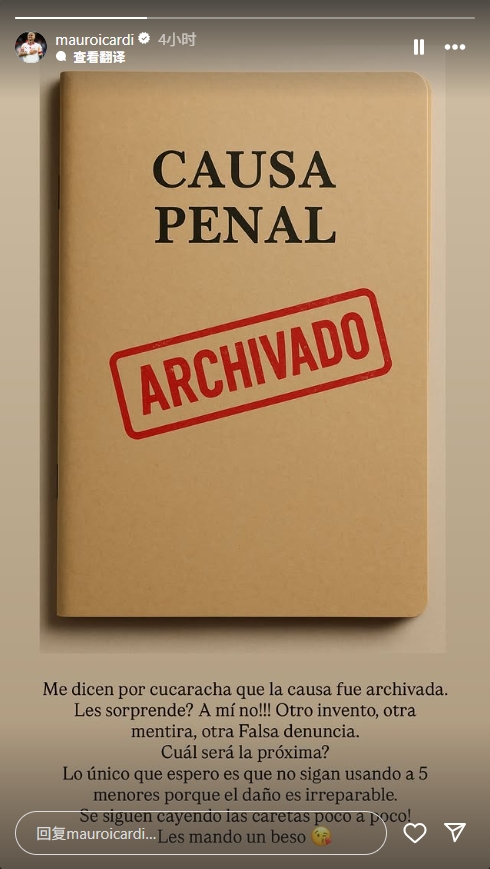本日,伊卡尔迪更新社媒复兴,他晒出一张附有“刑事案件 已了案”字样的图片,并配文:“又是一次持造,又是一个坏话,又是一桩诬陷。”