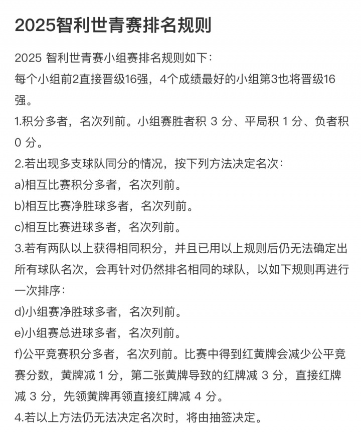 戏剧性!世青赛智利与埃及积分、互相战绩一模相同,少1张黄牌晋级