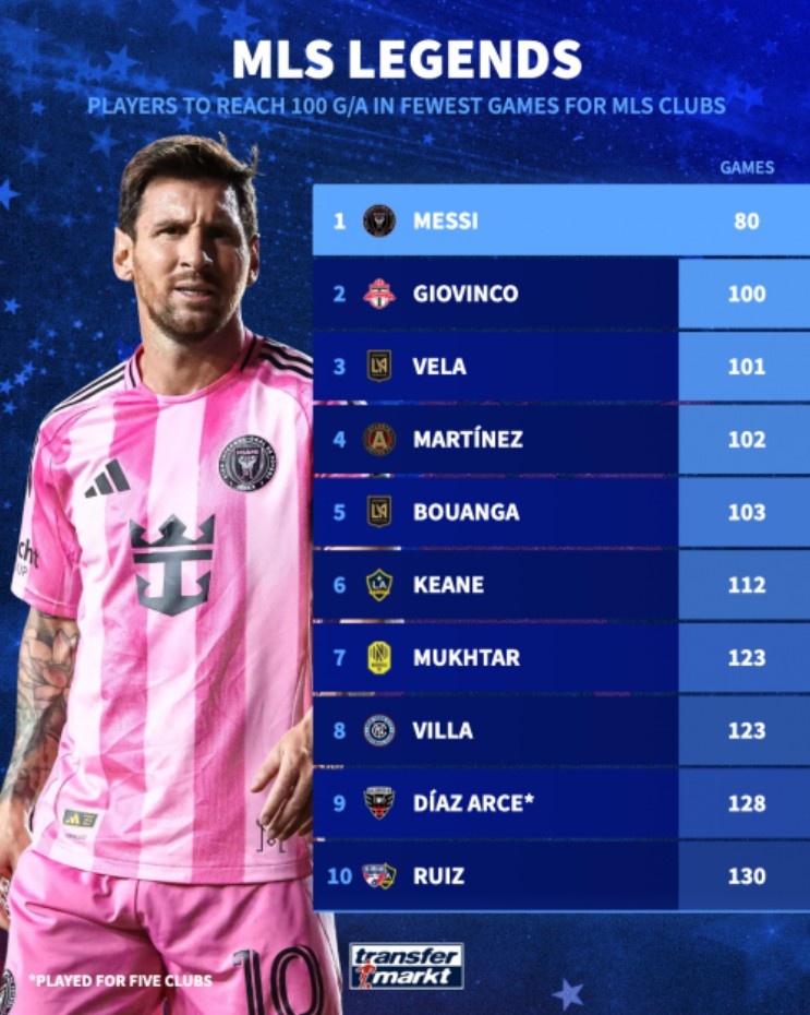 10月11日讯 离开欧洲足坛后,梅西加盟了好意思国大定约的迈阿密海外,阿根廷巨星保执了精良的景色。在为迈阿密出战80场比赛的情况下,梅西已径直参与101球,他成为好意思职联俱乐部历史参与百球所用场次最少球员。