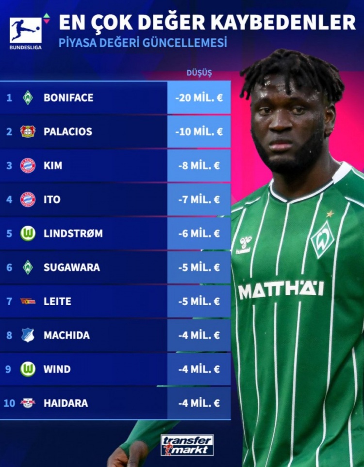 10月15日讯 德国转会市集公布了新一期的德甲球员身价情况,在跌幅榜上,博尼法斯跌2000万欧最多,帕拉西奥斯跌1000万欧位居次席。