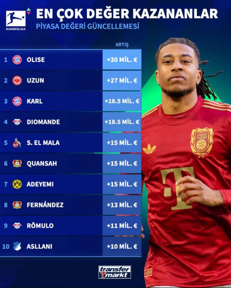 10月15日讯 德国转会商场公布了新一期的德甲球员身价情况,在涨幅榜上,奥利塞身价高涨3000万欧元最多,法兰克福小将乌尊高涨2700万欧元位居次席。