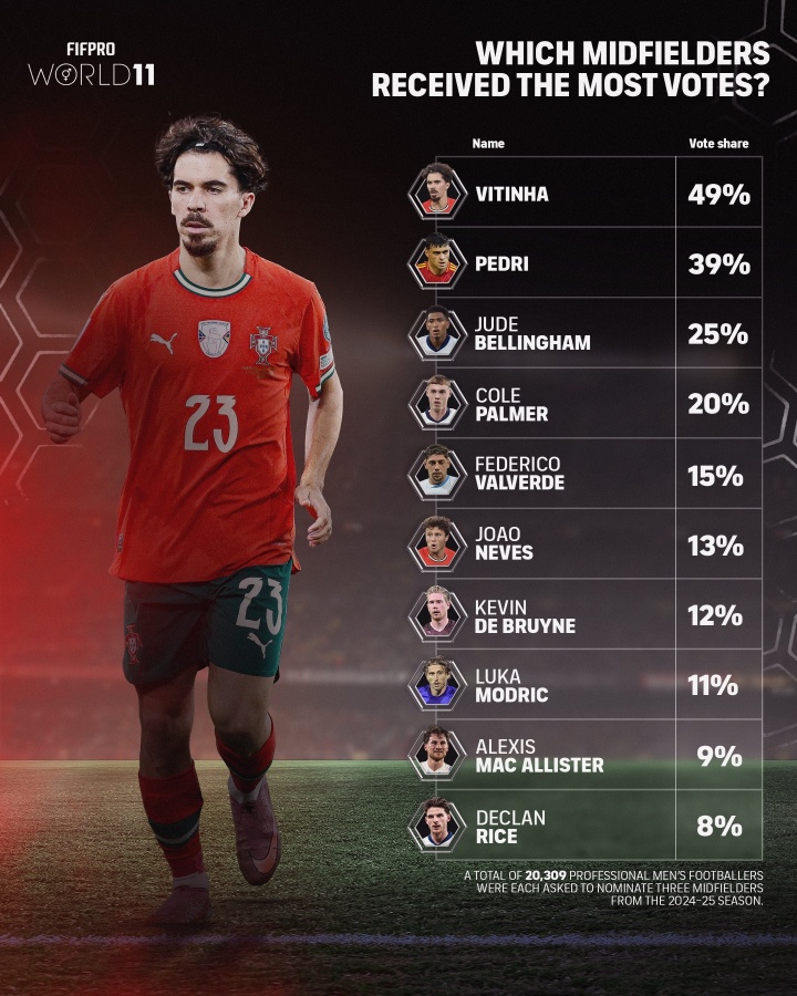 FIFPRO年度最好中场投票细节:贝林厄姆25%第三 赖斯8%第十
