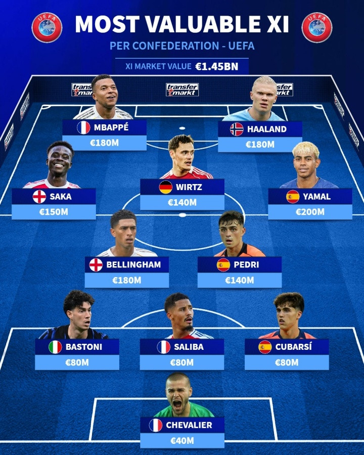 14.5亿欧梦之队! 欧足联最贵阵: 姆哈亚领衔, 巴萨3东说念主皇马枪手2东说念主