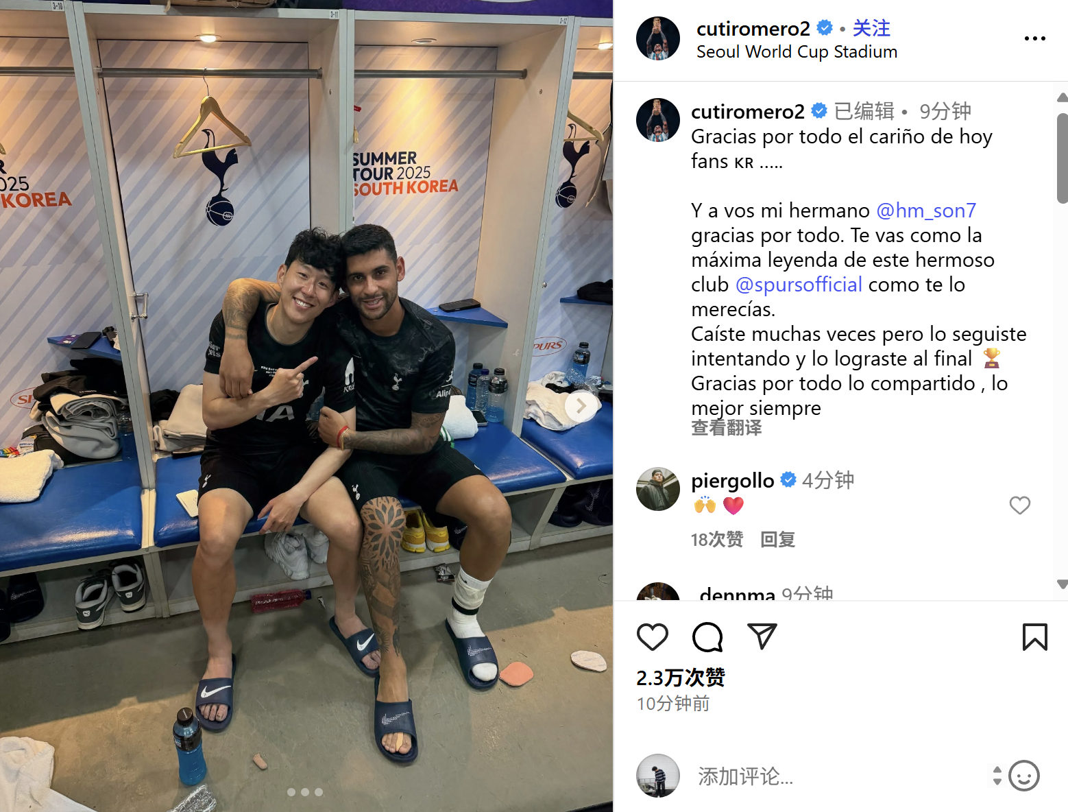雷速体育8月3日讯 遵守热刺十年的韩国球星孙兴慜此前宣布将在今夏离开球队,他刚刚规章了我方在热刺的告别战。队友罗梅罗也在社媒发晓谕别孙兴慜。