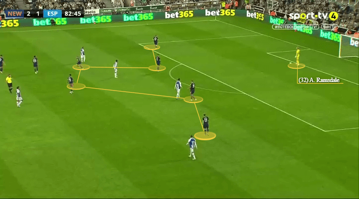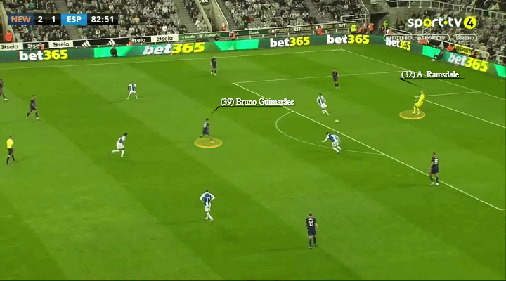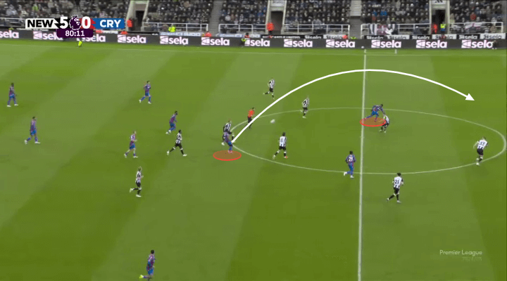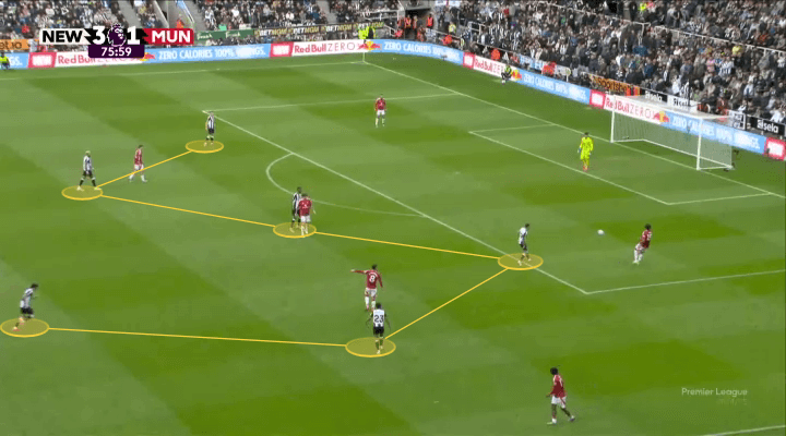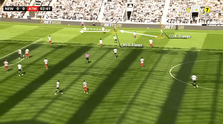 当纽卡斯尔联的又名边锋保抓无边站位时,另又名边锋往往插足禁区,准备策应传中。利夫拉门托、刘易斯-霍尔和特里皮尔则从边后卫位置向前插,束缚向禁区运送传中。