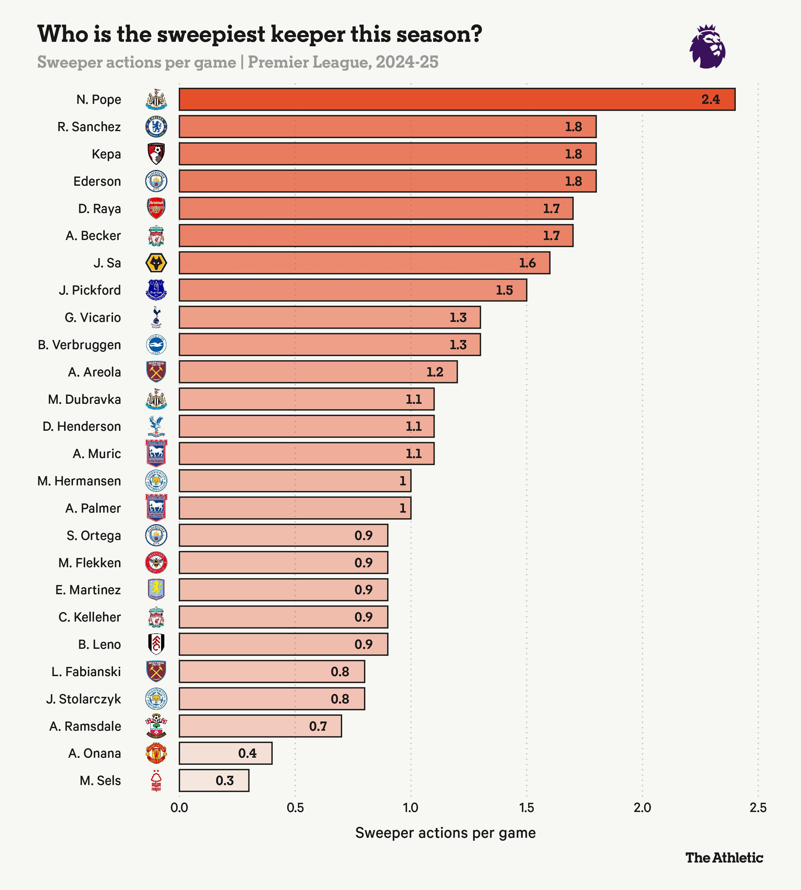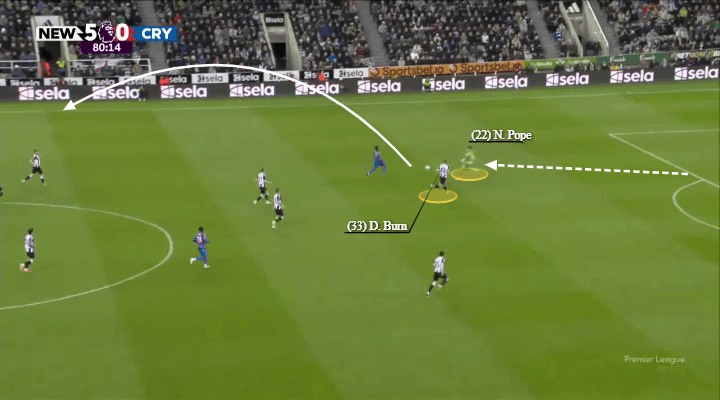 然则,即使纽卡斯尔联的防地回撤得更深,他们仍然依赖波普称心并能够走出禁区参与比赛(如下图四月对阵水晶宫时所示)。