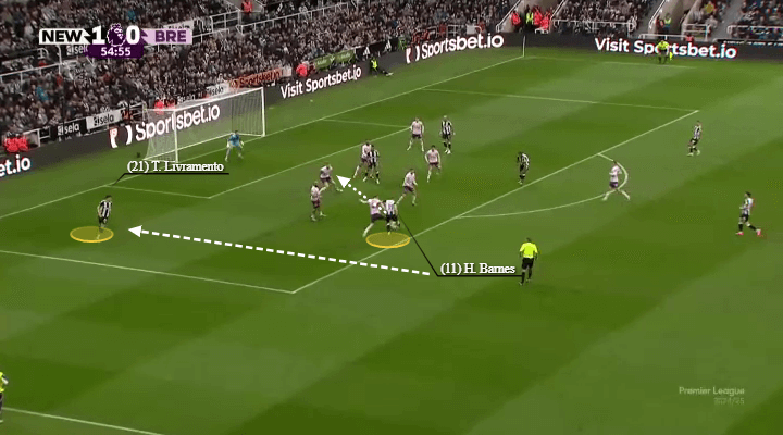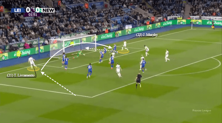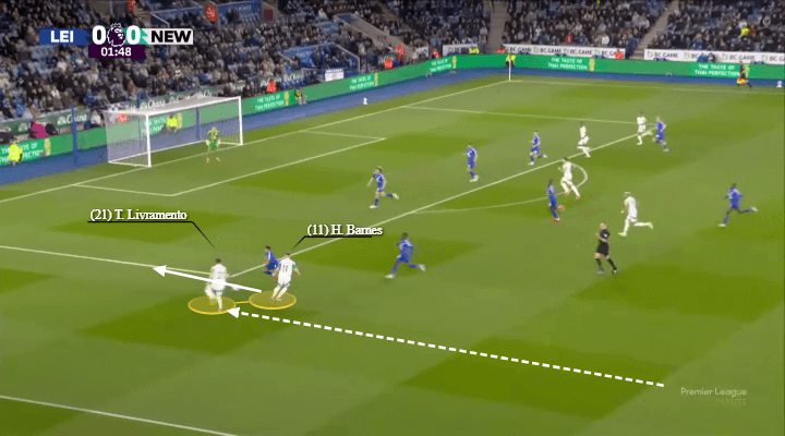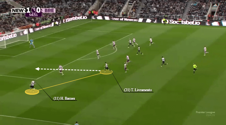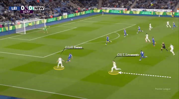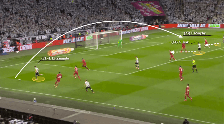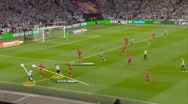 巴恩斯和利夫拉门托在上赛季左路拓荒了领悟,经常彼此进行叠加和反向套边合作。他们的聚积促成了纽卡斯尔联在联赛杯决赛中对阵利物浦的第二粒进球(如下图所示)。