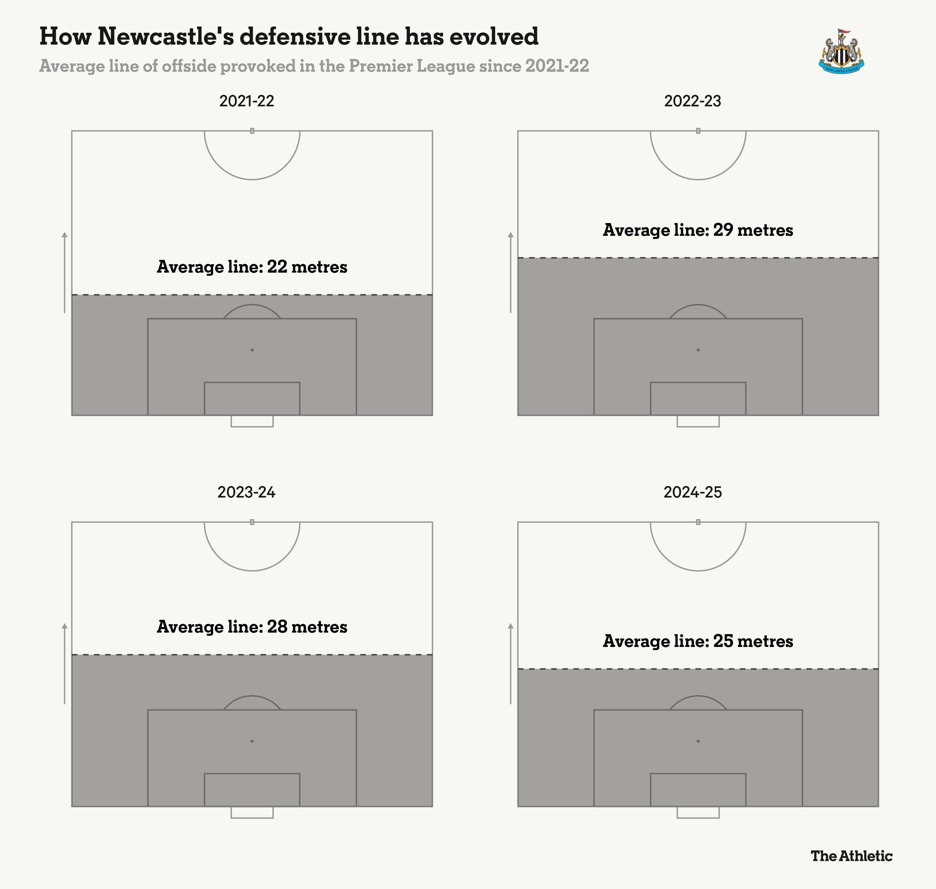 这记号着与贝尼特斯和布鲁斯期间比拟的弘大变化,那时的纽卡斯尔联镇守后场,试图反击。豪于2021年11月接办后,专注于稳当防地。在阿谁第一个赛季中,纽卡斯尔联的平均防地距离我方的球门22米。接下来的赛季,当纽卡斯尔联取得第四名时,他们的防地出动了7米,达到了29米。