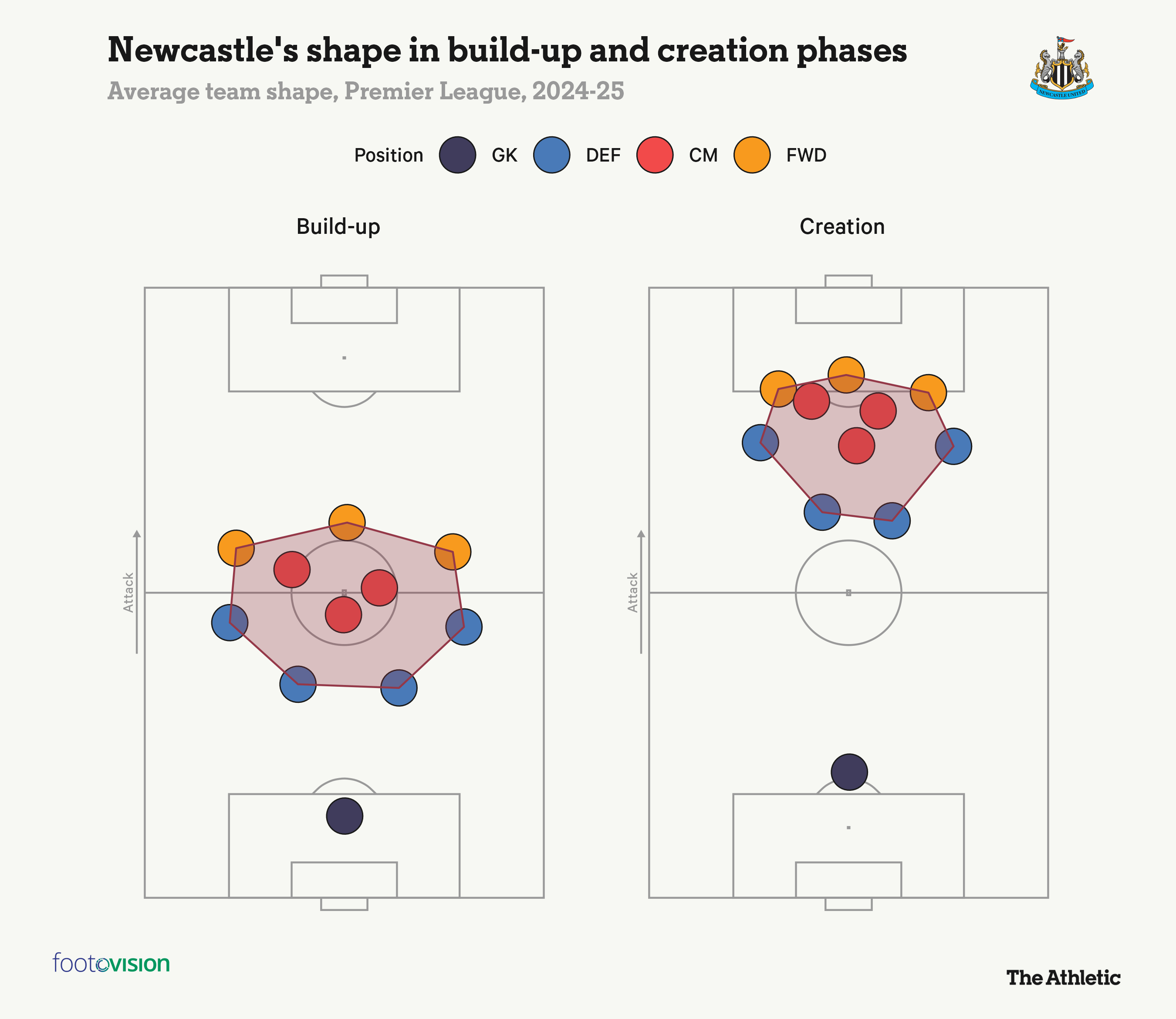 如下图所示,4-3-3的主导地位无庸赘述,图中炫耀了纽卡斯尔联球员在“组织”和“创造”阶段的平均站位。
