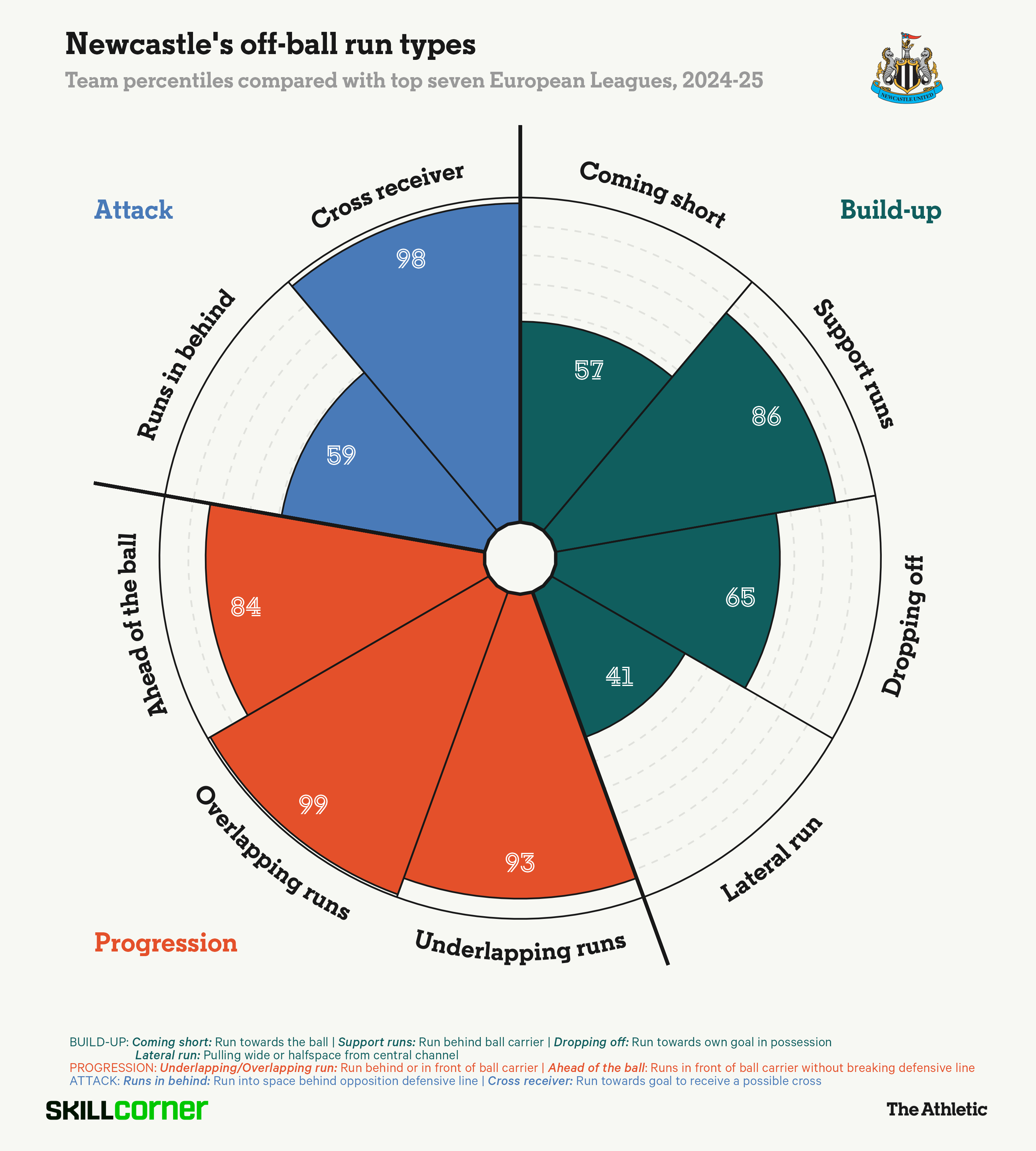 未卜先知,在2024-25赛季,纽卡斯尔联在欧洲领域内叠加跑动和反向套边跑动,以及策应传中的跑动方面名次靠前。
