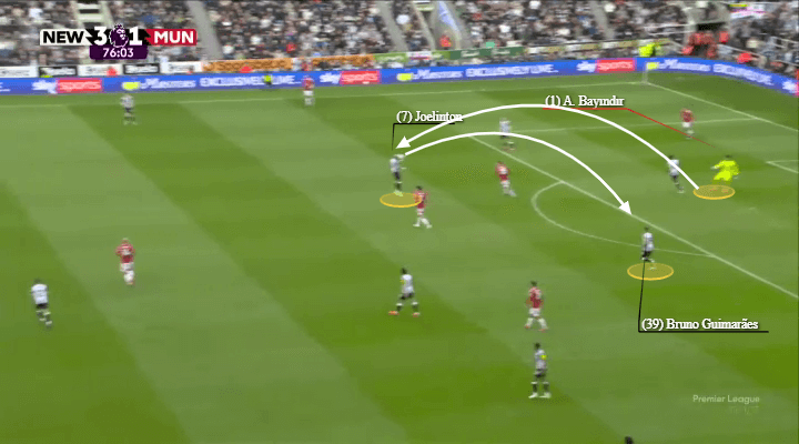 纽卡斯尔联并不是一直高位逼抢,而是选拔安妥的时机(和比赛)。他们在本年四月对阵曼联的比赛中后期遴选了这种方式,六名球员位于终末三分之一区域,最终吉马良斯得分。