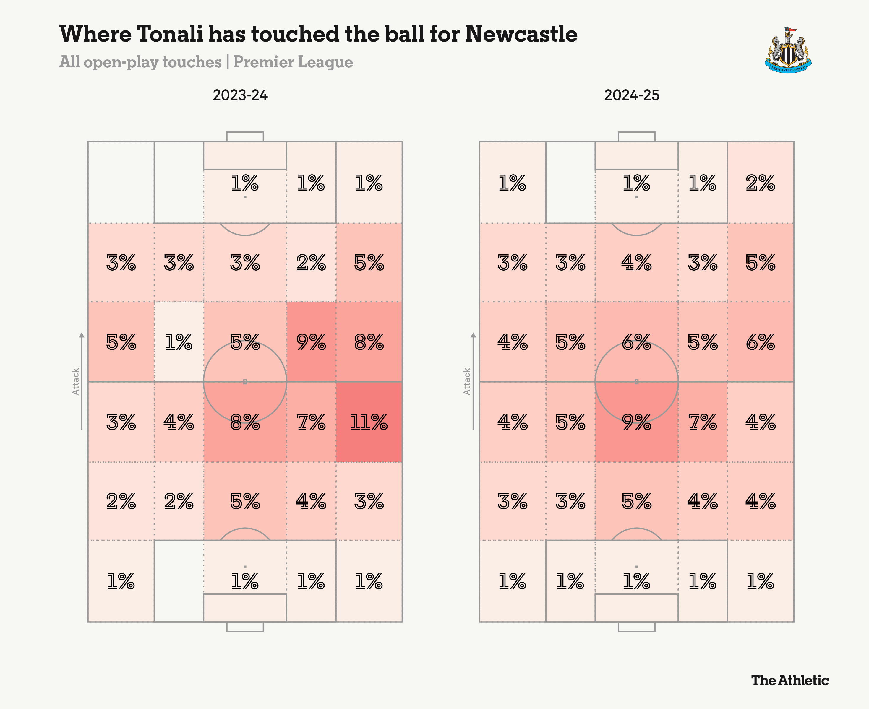 在他来到纽卡的头18个月里(在他因赌博罪被禁赛前后,他不错上场时),托纳利凡俗担任右侧8号位(中前锋)。下图炫耀了他一朝被移到2024-25年的深位中场后,在敞开比赛中触球区域的变化。