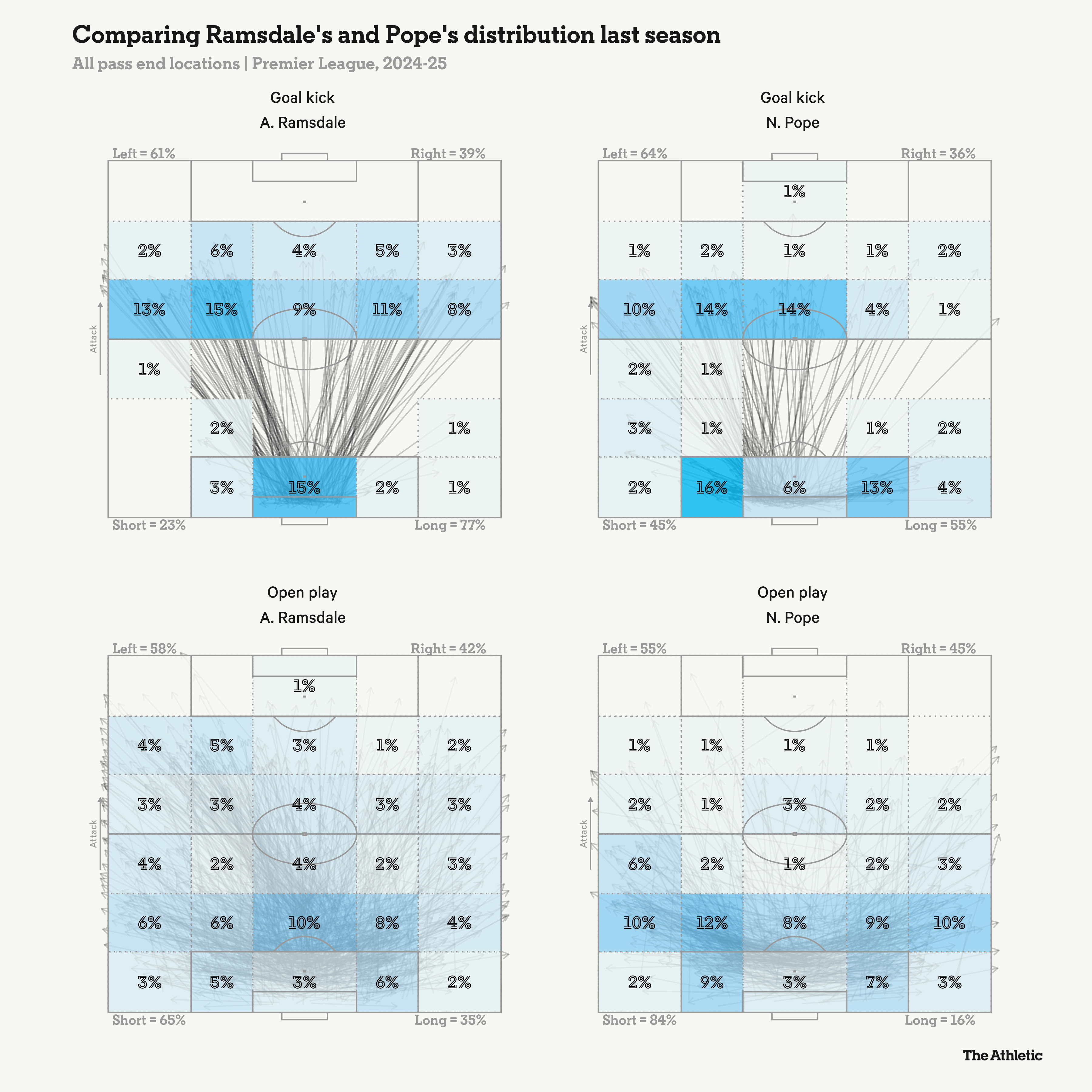 在敞开比赛中,如下图所示,拉姆斯代尔比波普更常使用长传(35%对比16%)。
