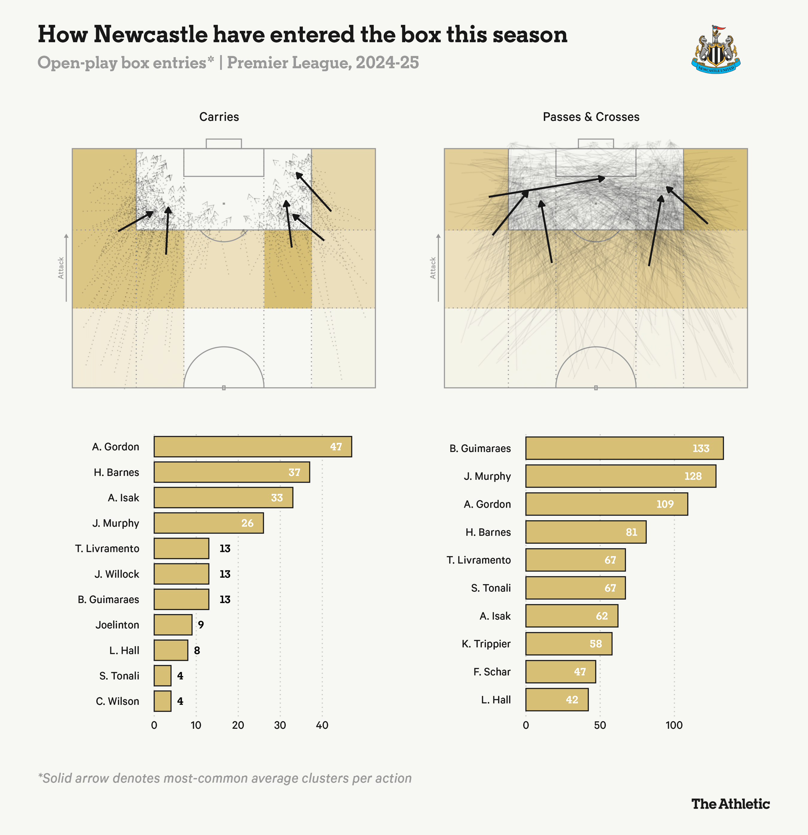 吉马良斯(133次)、墨菲(128次)和戈登(109次)提供了最多的传球插足禁区,而戈登(47次)、巴恩斯(37次)和伊萨克(33次)则是带球插足禁区最频繁的球员。傍边两侧传球和带球插足禁区的比例很是平衡,但纽卡斯尔联很少从中路带球冲入禁区。