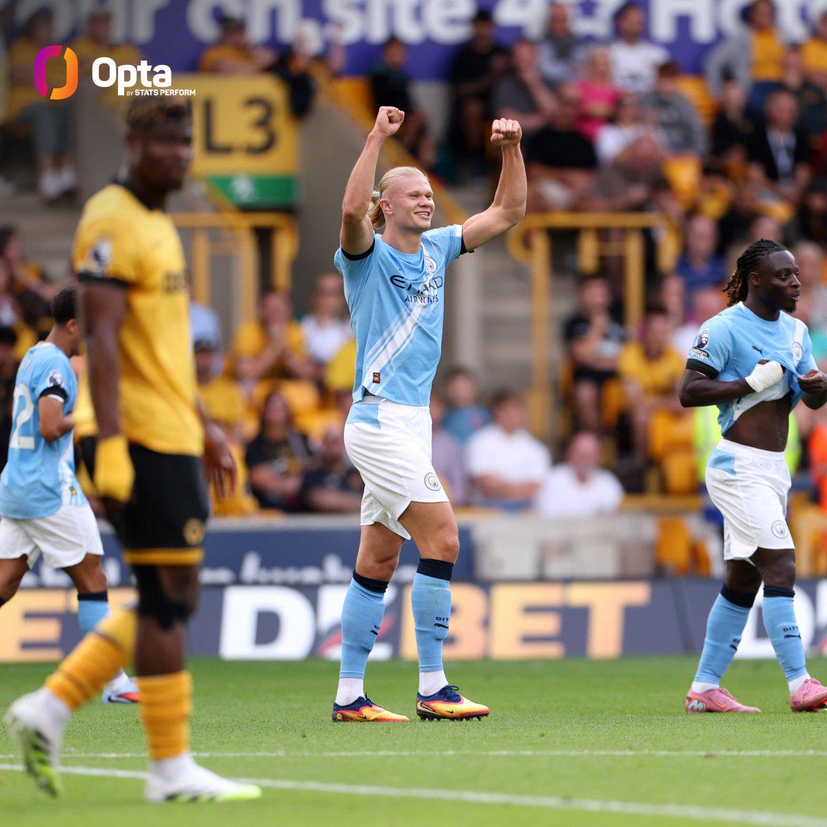 新赛季英超首轮,曼城客场对阵狼队,上半场为曼城首开记载,至此,哈兰德已运动4个赛季英超首轮比赛皆有进球,仅次于萨拉赫。