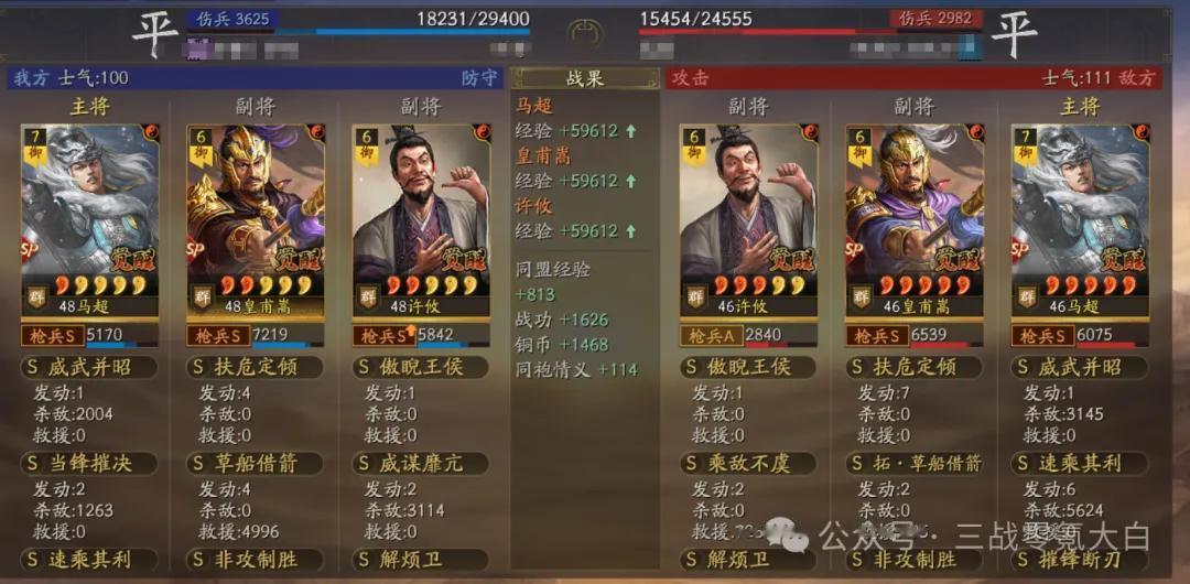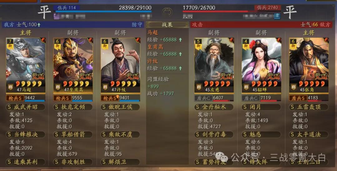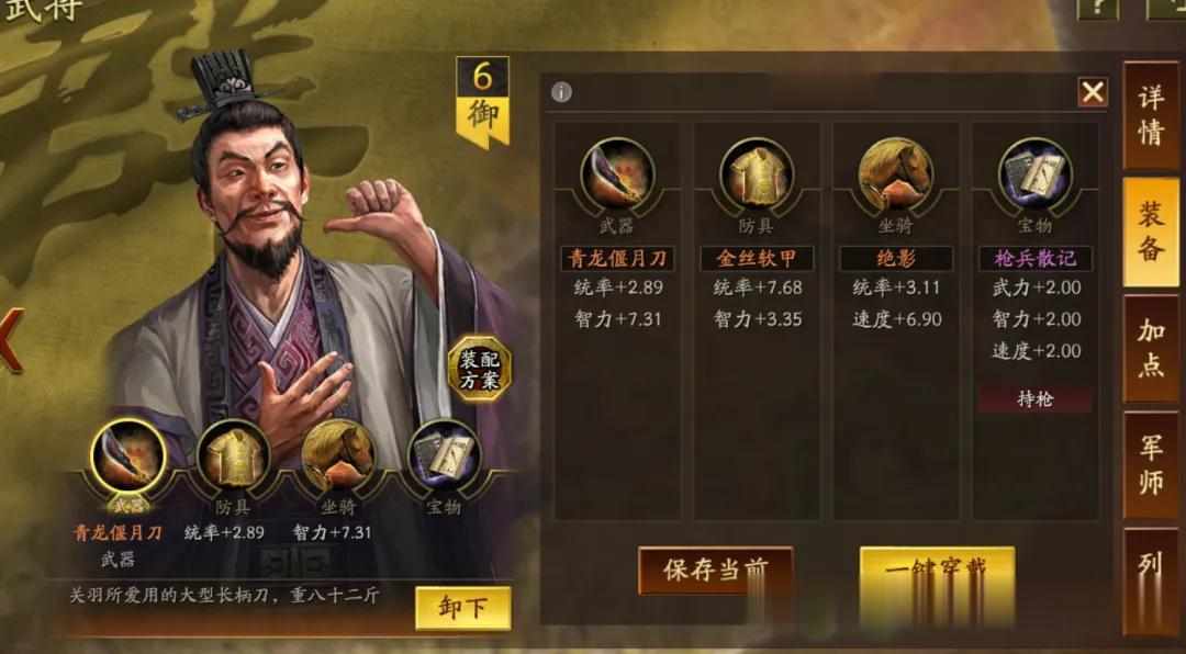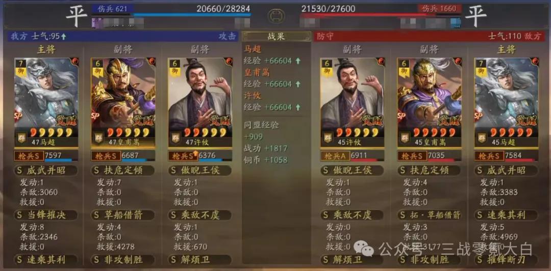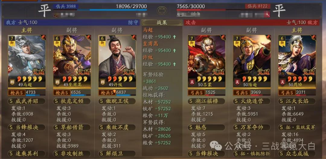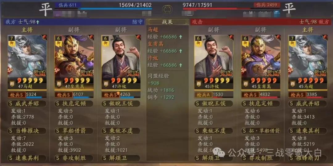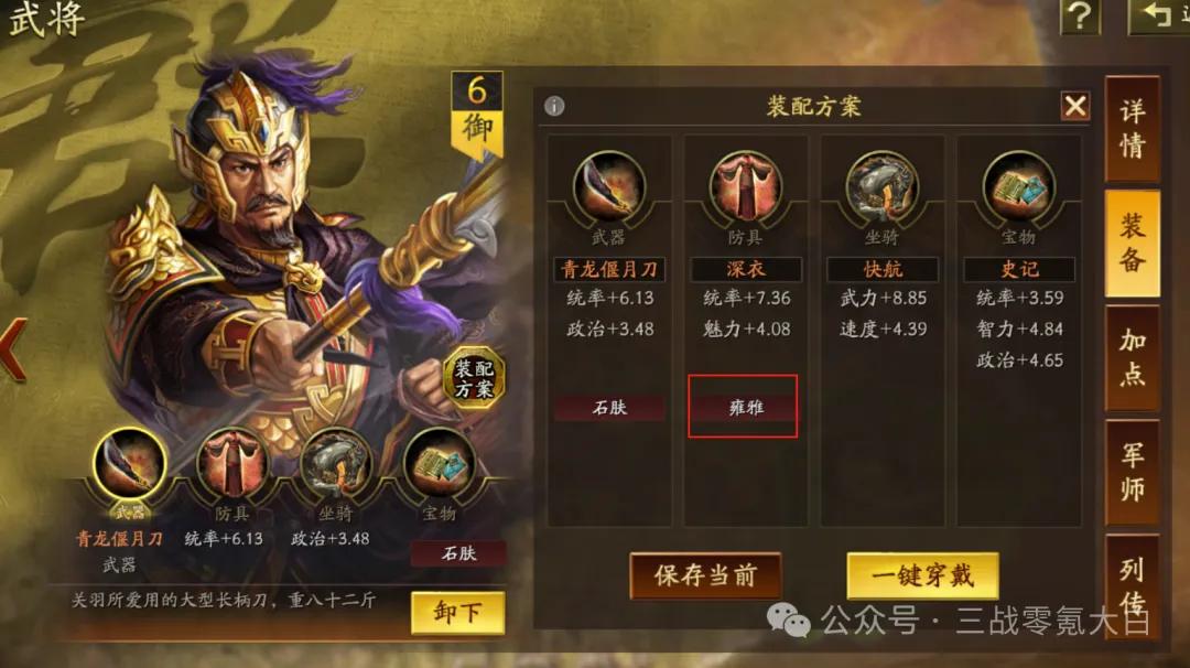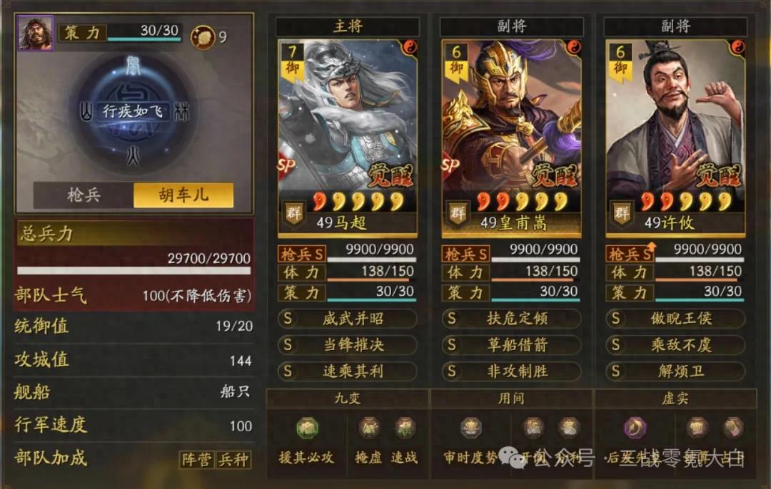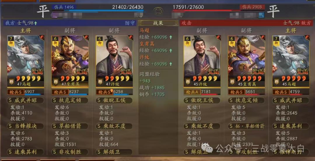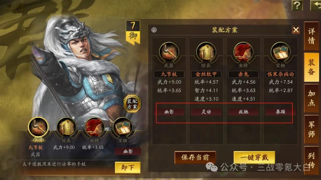 大白是选定sp马超落拓卷速率,是以佩戴了驰骋+幽影。同期带上灵动和急躁。sp皇甫嵩佩戴雍雅保证尾速,这么对战上万军皇马能卡尾速解掉规定恶果(大白上去换的雍雅,这个装备栽种还是不小的)。