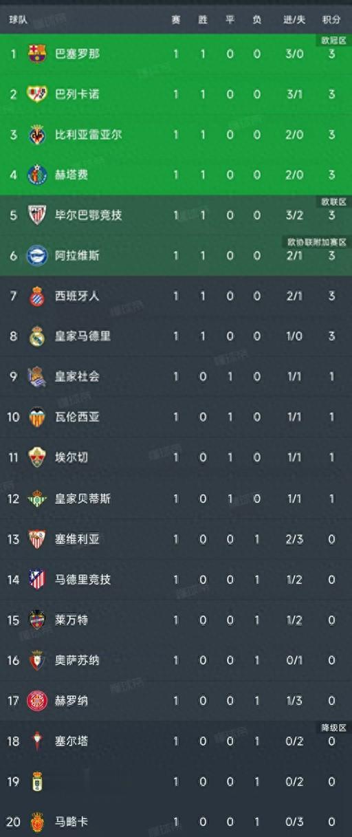 北京技艺8月20日,跟着皇马1-0小胜奥萨苏纳,西甲第一轮的比赛全部结果,咱们一齐望望最新的积分榜变动,一共有8支球队取得了开门红,2场比赛出现平局!