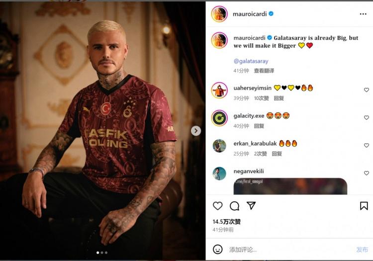 伊卡尔迪社媒晒配置穿加拉塔萨雷球衣的定妆照,配文:“加拉塔萨雷一经很伟大了,但咱们将让它愈加伟大。”