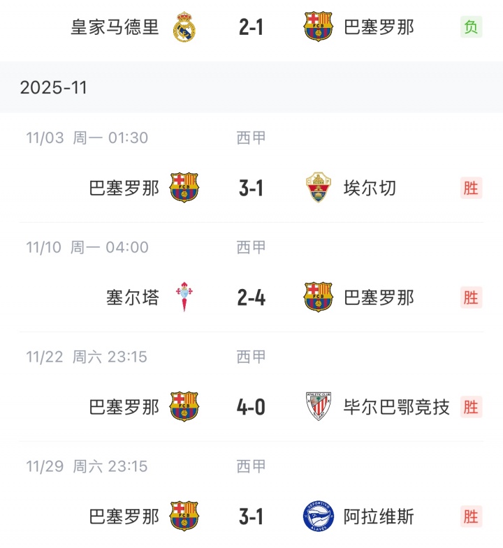 巴萨输掉国度德比后获取联赛四连胜,当今向上皇马1分。