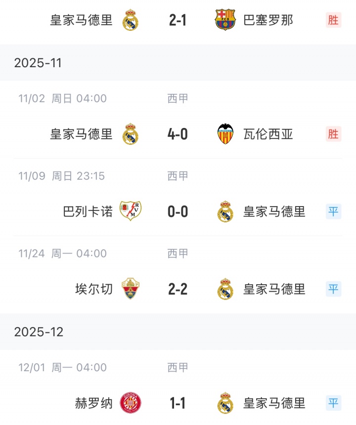 12月01日讯 西甲第14轮,皇马1-1客平赫罗纳,让出榜首。