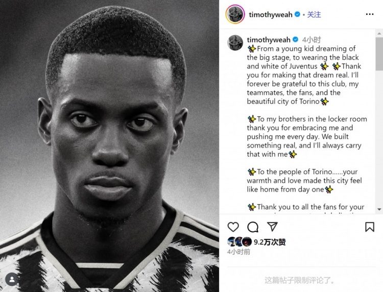 蒂莫西-维阿社媒写谈:“从一个梦念念登上大舞台的小男孩,到身披尤文口激辩袍的球员,感谢你们让这个梦念念成真。我将始终谢意这家俱乐部、我的队友、球迷以及好意思艳的齐灵城。