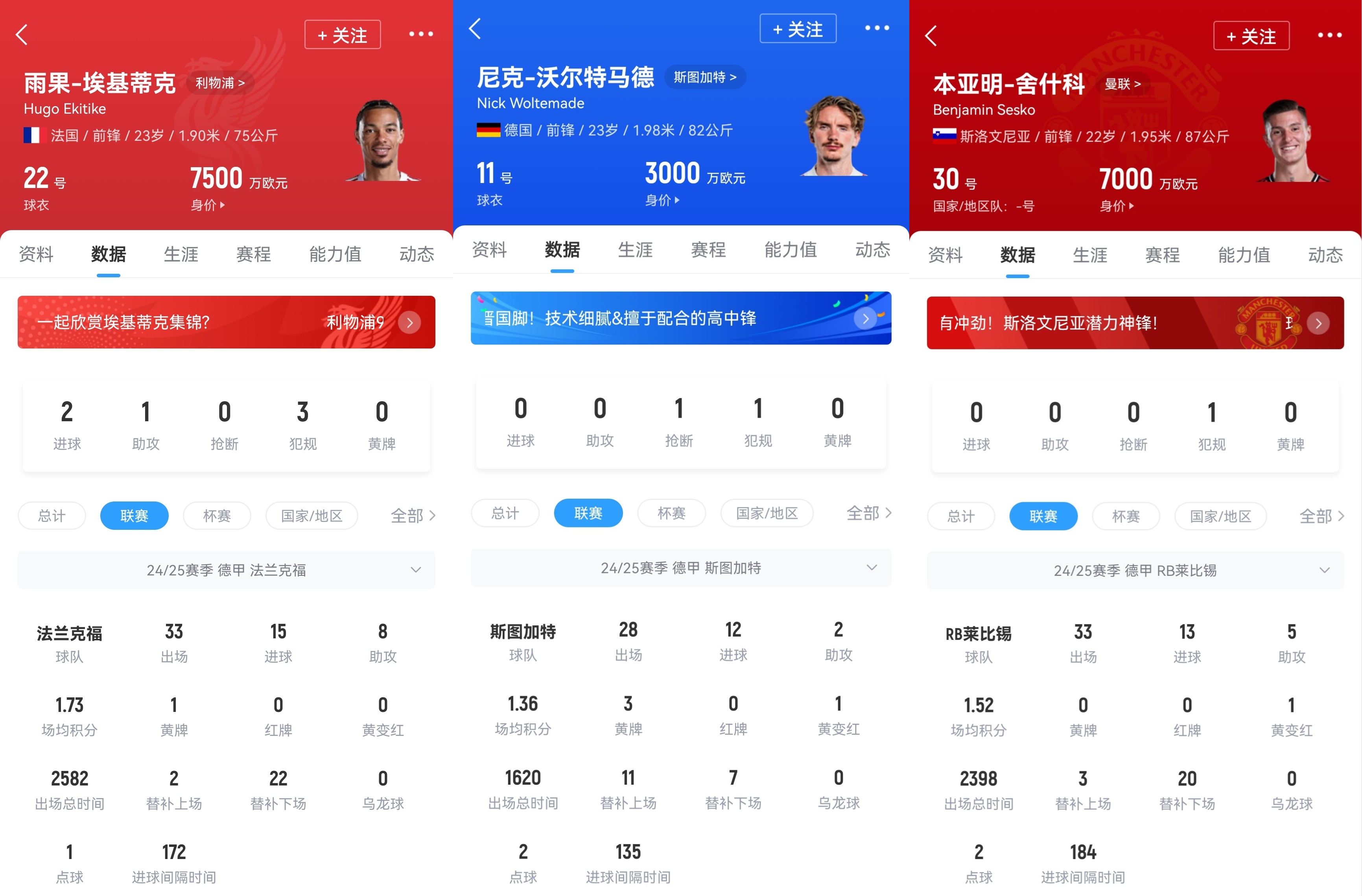 埃基蒂克 德甲33场15球8助 转会费8000万固定+1500万浮动(1000万容易驱散)
