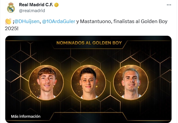 此前金球未发文,皇马祝福赫伊森、居莱尔和马斯坦托诺进金童候选