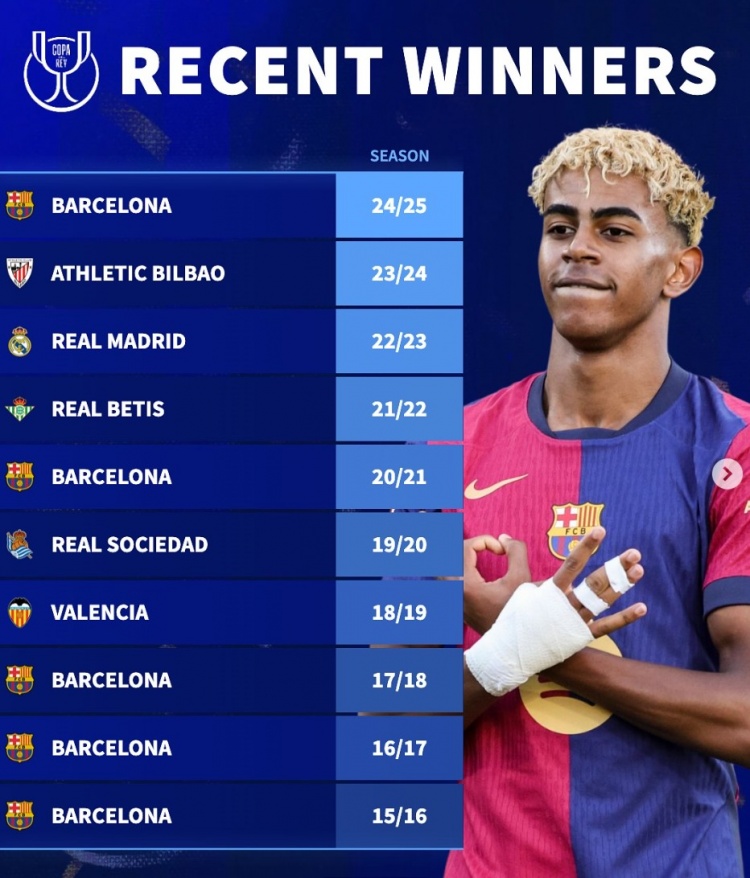 德转列近10年国王杯冠军:巴萨5次登顶,皇马仅在2023年夺冠